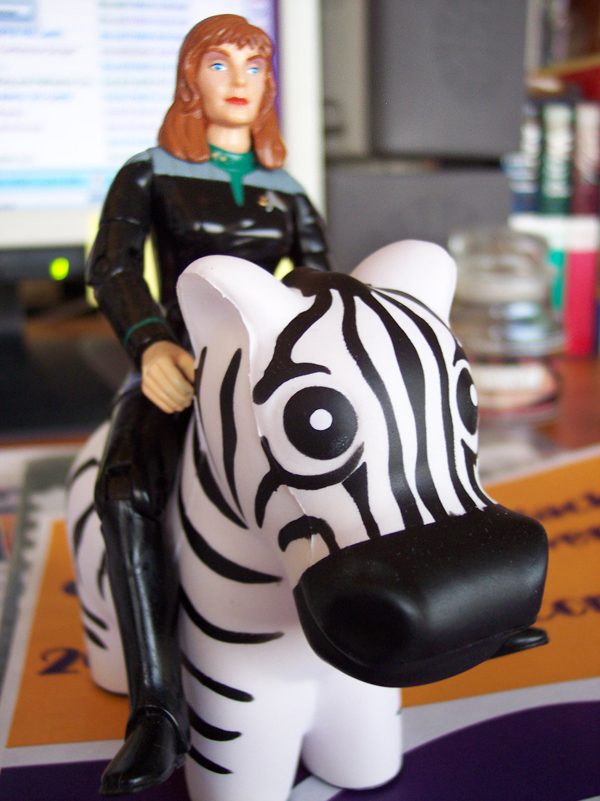 Something simple and silly this morning, denizens: This is my First Contact Dr. Crusher action figure astride a zebra stress squishie. She sits on my desk here at work. Right next to her is Data on a cow stress squishie (but he’s not in this photo because this is Doctober, not Datatober, dammit).